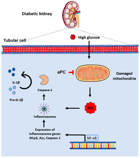 The pathogenesis of DKD is closely linked with sterile inflammation and mitochondrial dysfunction. We previously demonstrated that the anticoagulant and cytoprotective coagulation protease aPC protects against experimental DKD through receptor-dependent mechanisms, independently of its anticoagulant function [6,10,14,15,20,24]. In previous work, we focused mostly on the glomerular compartment, and we were able to demonstrate that aPC reduces mitochondrial ROS generation in glomerular cells. Here, we demonstrate that aPC likewise protects against glucose-induced increased ROS generation in tubular cells. Reduced tubular ROS generation in diabetic mice expressing a mutant protein C variant resulting in elevated plasma levels of aPC (APChigh mice) [6] was associated with reduced inflammasome activation and the reduced accumulation of macrophages in the tubular compartment. Taken together, these results establish that the cytoprotective coagulation protease aPC decreases glucose levels and induces excess ROS generation and sterile inflammation in the tubular compartment.