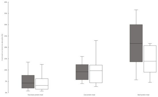 The absorbance quota, analyzed by the erythrocyte-incorporated iron using liquid scintillation, was 2.7 times greater for the cod-protein meal compared to the texturized fava bean meal and 4.2 times greater for the beef-protein meal compared to the texturized fava bean meal.