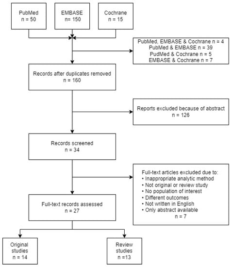 Our search approach yielded up 215 studies identified through database searching; a total of 14 original research studies and 13 review studies remained. After consideration, it was decided to include only the 14 original studies in this review.