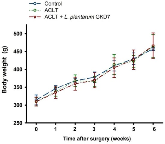 Oral live L. plantarum GKD7 did not affect body weight in the OA rat model. Body weights of ACLT rats that did or did not receive oral live administration of live L. plantarum GKD7 were not significantly different from those of controls.