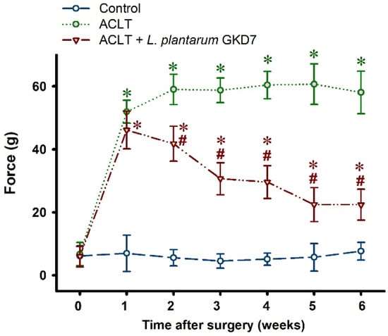 By week 6, all 3 study groups had steadily gained body weight from baseline, without any significant between-group differences (Figure 1). At week 1, measurements of asymmetry in weight-bearing posture did not differ significantly between the ACLT-only and ACLT + L. plantarum GKD7 groups (52.0 ± 3.7 g vs. 46.1 ± 6.0; p = 0.06). From week 1 onwards, ACLT-only rats exhibited severe asymmetry in weight-bearing posture, whereas pain-related behavior in the ACLT + L. plantarum GKD7 group was markedly improved from the second week onwards; by week 6, the asymmetry in weight-bearing behavior was approximately half that of the ACLT-only group (22.4 ± 5.0 g vs. 58.1 ± 6.7 g; p ≤ 0.05) and close to that of the control group (7.7 ± 2.8 g; p < 0.05) (Figure 2).