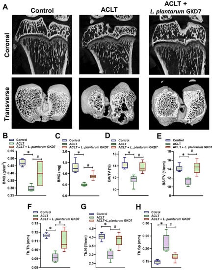 Representative micro-CT images of the right knee joint from rats in the sham-operated group, the ACLT-only group, and the ACLT + L. plantarum GKD7 group. (A) Representative coronal and transverse micro-CT images of rat knees in each study group. Quantitative analyses of (B) BMD, (C) BMC, (D) BV/TV, (E) BS/TV, (F) Tb.Th, (G) Tb.N, and (H) Tb.Sp. * p < 0.05 vs. controls; # p < 0.05 vs. the ACLT-only group.