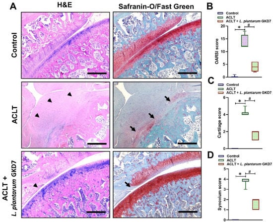Staining by H&E and Safranin-O/Fast Green revealed less injury (imaged were more intact) in articular cartilage samples from the controls and ACLT + L. plantarum GKD7 group compared with the minimal cartilage in the ACLT-only samples (Figure 4A). ACLT-induced synovial inflammation (marked by arrowheads) and cartilage damage (arrows) were minimal in the ACLT + L. plantarum GKD7 samples, but very apparent in the ACLT-only samples (Figure 4A). OARSI, cartilage, and synovium scores were significantly superior in the ACLT + L. plantarum GKD7 group compared with scores in the ACLT-only group, while the ACLT-only scores were significantly superior compared with the control group (Figure 4B–D).