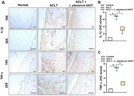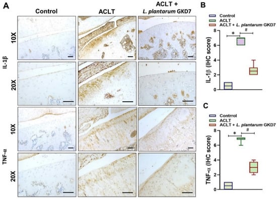 Oral live L. plantarum GKD7 reduced levels of TNF-α and IL-1β expression in OA synovium. (A) IHC staining of IL-1β and TNF-α in representative synovium from controls, ACLT-only rats, and ACLT + L. plantarum GKD7 rats. Quantitative analyses of (B) IL-1β and (C) TNF-α in synovium. Scale bar = 100 µm. * p < 0.05 vs. controls; # p < 0.05 vs. the ACLT-only group.