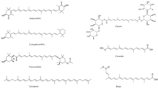 Carotenoids are organic, liposoluble pigments distributed in colored fruits, vegetables, photosynthetic bacteria, fungi, algae, and some fish [1]. Carotenoids are responsible for characteristic colors found in nature; for example, green leafy vegetables contain high amounts of xanthophylls and hydrocarbon carotenes, lycopene is present in ripe tomatoes, β-carotene is responsible for the orange color of carrots, capsanthin gives red color to peppers, and astaxanthin dyes crustaceans pink and red [1]. Carotenoids are not only substantial pigments involved in photosynthesis (along with chlorophylls) in photosynthetic bacteria, algae, and plants, but they also act as photoprotectors, color attractants, antioxidants, and precursors of plant-derived hormones [2]. Carotenoids are classified into two main groups, depending on their chemical structure and functions: xanthophylls (lutein, zeaxanthin, and astaxanthin) and carotenes (α-carotene, β-carotene, and lycopene) [3]. In humans and animals, who are not able to synthesize carotenoids de novo, these compounds need to be ingested with food or supplemented, as they play an important role as vitamin A precursors and bioactive compounds, which may participate in many physiological processes [2]. Although more than 850 carotenoids have been identified so far in the natural environment, only about 50 of them are found in the typical human diet [2]. However, only about 20 types of carotenoids have been found in human blood and tissues [4], among which β-carotene, α-carotene, lycopene, β-cryptoxanthin, lutein, and zeaxanthin are most often identified [2,4]. It has so far been demonstrated that carotenoids are able to perform many biological functions due to their antioxidant, anti-inflammatory, and anti-tumor activities; they also have the ability to inhibit angiogenesis, induction of apoptosis, cell cycle arrest, and enhance the immune response [1]. Furthermore, α-carotene, β-carotene, γ-carotene and β-cryptoxanthin possess pro-vitamin A activity, thus participating in the process of vision, and influencing the proper growth and development of bones and the proper functioning of the epithelium.