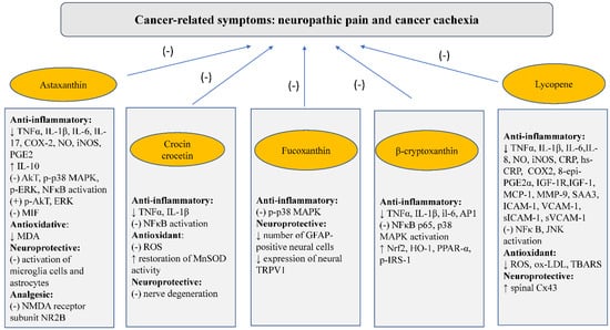 Thus, carotenoids with both anti-inflammatory and antioxidant properties seem to be an excellent example of naturally occurring active substances capable of alleviating neuropathic pain. Additional carotenoid supplementation in parallel with standard analgesic treatment may not only contribute to better pain control and alleviation of side effects of treatment, but also due to additional properties may improve other inflammation-related symptoms, such as cancer-related cachexia, anorexia, or asthenia. In the following subsections, the authors will try to determine whether the results of the studies conducted so far support the benefits of additional supplementation of carotenoids such as crocetin/crocin, astaxanthin, β-cryptoxanthin, fucoxanthin, bixin, and lycopene in the treatment of neuropathic pain.