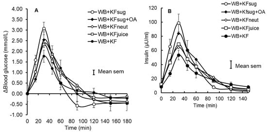 The plasma insulin responses were measured in duplicate, with an average CV of 7.16%. They very closely tracked the blood glucose responses (Figure 1B, Table 3) and the iAUCs for blood glucose (x) and insulin (y) up to 30 min, as a percentage of the WB+KFsug control, correlated closely (R2 = 0.97, y = 1.03x − 2.3).