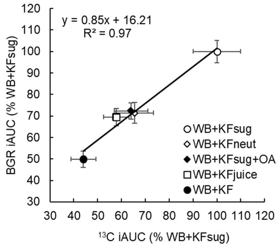 Up to 30 min post ingestion, which was the time of peak blood glucose, the cumulative iAUC for blood glucose (Table 2) and 13CO2 (Table 5) correlated closely (y = 0.75x + 25.87, R² = 0.97), showing substantial and similar effects of the treatments on rate of absorption of glucose and 13C acetate (Figure 4). Compared with the WB+KFsug control, whole kiwifruit (WB+KF) suppression of 13CO2 at 30 min (56%, p < 0.001) was close to the glycaemic response suppression (50%, p < 0.001) at 30 min. Neutralizing (WB+KFneut), removing fibre (WB+KFjuice) or adding organic acids (WB+KFsug+OA) significantly reduced cumulative 13CO2 exhalation at 30 min, by 35-42% (p < 0.001) (Table 5), and reduced blood glucose iAUC at 30 min by 28–31% (p < 0.001) (Table 2).