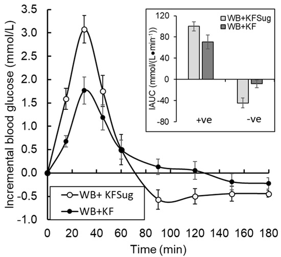 Effect of non-sugar kiwifruit components on glycaemic fluctuation as proportions of hyper- (+ve iAUC) and hypo- (-ve iAUC) glycaemia in the 180 min period following ingestion of WeetBix (WB) plus kiwifruit sugars (WB+KFsug), or WB plus whole kiwifruit (WB+KF). The curves do not include a fructose contribution to relative reduction in glycaemic response by KF, because it was excluded by the formulation (Means ± SEM).