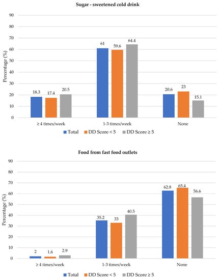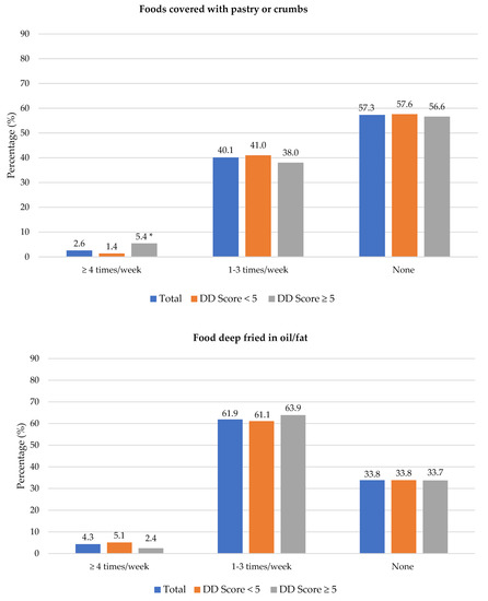 The frequency of consumption of selected foods was used to reflect food choices. Figure 3 shows the frequency of consumption of selected unhealthy foods. Participants with adequate DD more frequently consumed foods covered with pastry/crumbs, butter/ghee/margarine/oil (at least four times/week), cookies, sweets and salty foods (1–3 times/week) than participants with low DD. The Spearman correlation test showed a weak positive relationship between the DD score and the sugary food score (r = 0.139, p < 0.01).