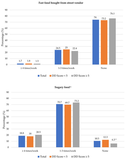Frequency intake of selected unhealthy foods by dietary diversity (DD) score categories. * Significant difference between DD score categories at p < 0.05 level; a Based on a calculated sugary food score.