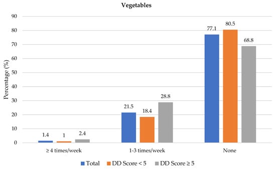 Figure 4 shows the frequency of consumption of fruit juice, and fresh and vegetables. Participants with adequate DD more frequently consumed fruit juice (1–3 times/week) than participants with low DD (45.4% vs. 33.4%). Fresh fruit was consumed at least 4 times/week by significantly more participants with adequate DD compared to those with low DD (41.5% vs. 25.6%). Overall, 23.5% (n = 163) participants consumed fresh fruit and 40.1% (n = 278) consumed vegetables daily (data not shown in table). Of the 693 participants, 42.6% did not eat fruit and 28.6% did not eat vegetables daily because of financial constraints. A higher percentage of participants with low DD compared to those with adequate DD reported financial constraints as barrier for daily intake of fruits (47.1% vs. 31.7%) and vegetables (32.0% vs. 20.5%) (Supplementary Table S1).