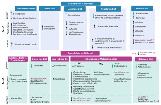 Considering the great impact of the diet on gut microbiota, a deep knowledge of the potential microbe-mediated host effects of feeding mode in infancy and childhood is required [8]. Moreover, specific dietary interventions utilized in children should also be evaluated in relation to their potential effects on the gut microbiome. The aim of this review is to highlight changes in the gut microbiota in infants and children on a special diet for therapeutic requirements and potential health implications.
