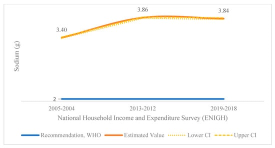 The 2018–2019 ENIGH found a decreasing trend in apparent sodium intake at the national level, when comparing it to the 2012–2013 survey (from 3.86 to 3.84 g/person/day). Although the value continues to exceed the maximum recommended sodium intake per day per person [5,6,7], this is an important accomplishment for public health. This success is partly due to the launch in late 2012 of the salt/sodium intake reduction program [49], which has managed to interrupt and stabilize over a six-year period the increase in sodium intake. Moreover, the program had an impact on the salt/sodium available for consumption (0.52% reduction, p < 0.05).