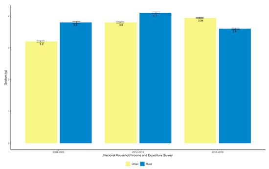 A higher sodium availability trend was found in the urban areas in the 2018–2019 survey (3.7%), while in the rural areas there is a decreasing trend (12.2%). These changes can be explained by the fact that urban areas present a greater exposure, availability, and access to foods high in salt, fat, and sugar in the food environment than that in rural areas [34,52].