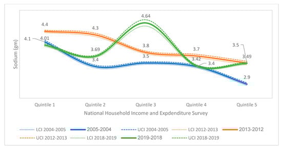 Figure 3 compares sodium availability for consumption by income quintiles, with a minimum of 2.90 g/person/day in quintile V (2004–2005) and a maximum of 4.64 g/person/d in quintile III (2018–2019). There was no linear relationship with the income level. When comparing surveys, significant differences were found between all income quintiles (p < 0.05).