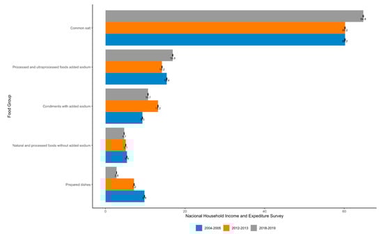 Trends in consumption of sodium food sources were estimated comparing the results of the analysis made in the 2004–2005 and 2012–2013 ENIGHs [13], with those of the present study (2018–2019). This information is comparable, except for exceptions due to updates in the food supply, as the same methodology was used [13]. A descriptive and inferential statistics analysis was performed to determine differences within periods. Student’s t-tests were used to compare each income quintile between the surveys, while a regression model (Generalized Linear Model) was used to investigate trends between the income quintiles within each survey. In each unit of analysis, the expansion factor was considered. This factor is obtained as the inverse of the probability of selecting each house at the time of selecting the sample. We tested the hypothesis (differences in the consumption of sodium between income quintiles and surveys) at the significance level of 5% by the Student’s t-test using the SPSS version 21.0 software [29].