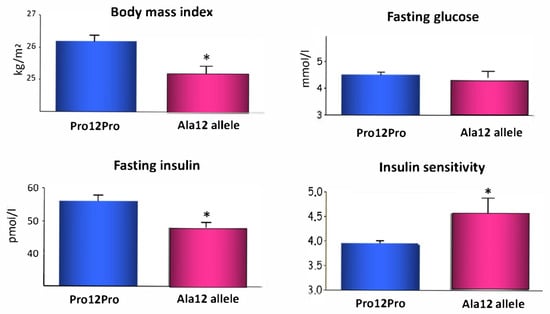 Body mass index and fasting insulin were significantly decreased and insulin sensitivity was increased (* p < 0.05) in the carriers of the Ala12 allele of PPARG2.