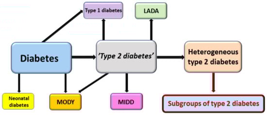 Diabetes is defined by elevated glucose levels, either in the fasting state or postprandially. The most common type of diabetes is T2D, which accounts for about 80% of all cases. Type 1 diabetes occurs in about 10% of cases, and latent autoimmune diabetes of the adult (LADA) occurs in about 5% of cases [70]. MODY and other monogenic forms of diabetes and secondary diabetes cover the rest of diabetes cases. T2D does not have an accurate definition, and therefore it is a diagnosis of exclusion. Quite often studies on T2D include patients with misdiagnosed forms of diabetes, especially LADA and type 1 diabetes. Therefore, it is important to identify and exclude other diabetes subtypes when investigating the subgroups of T2D (Figure 3).