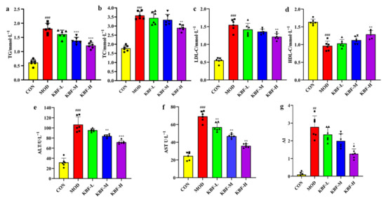 KBF on blood lipid in hyperlipemia rats. (a) Level of serum lipids including TC; (b) TG; (c) LDL-C; (d) HDL-C; (e) ALT; (f) AST; (g) AI. Data are expressed as the mean ± SD (n = 6). (## p < 0.01, and ### p < 0.001 versus CON), (* p < 0.05, ** p < 0.01, and *** p < 0.001 versus MOD).