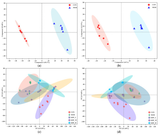 PLS-DA score plots between model and normal groups in the negative modes ((a), R2 = 0.964, Q2 = 0.934); positive modes ((b), R2 = 0.973, Q2 = 0.947); PCA score plots for the MOD, CON, KBF-L, KBF-M, and KBF-H groups in positive (c) and negative (d) modes.