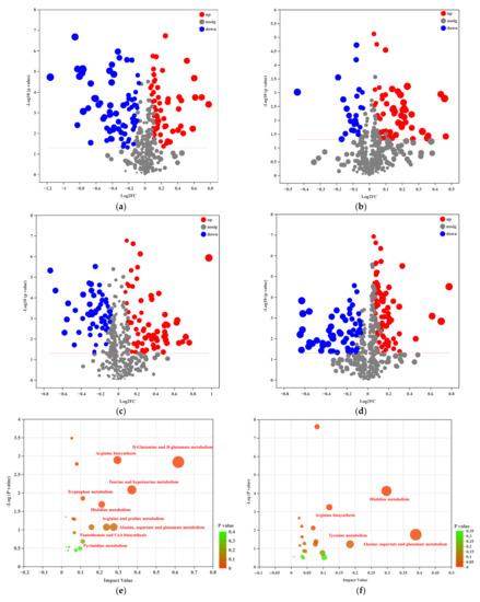 The original data measured on the computer were preprocessed to facilitate the screening and analysis of potential target differential metabolites. For metabolomics analysis, Progress QI (Waters, Milford, MA, USA.) was used for data processing, baseline filtering, peak identification, integration, retention time correction, and peak alignment. An accuracy error of 10 ppm was set in both MS and MS/MS data to confirm the tentative identification of metabolites. The available online databases, including HMDB (http://www.hmdb.ca, (accessed on 25 February 2022)) and METLIN (https://metlin.scripps.edu, (accessed on 25 February 2022)), were used to identify the chemical structure and name of metabolites through the obtained data. The resulting matrix was further reduced after removing peaks with the missing value in more than 80% of samples. Principle component analysis (PCA) and orthogonal partial least squares-discriminant analysis (OPLS-DA) were subsequently used to evaluate the overall difference between groups using the free online platform of Majorbio Cloud Platform (https://www.majorbio.com, (accessed on 25 February 2022)). The metabolic pathway was analyzed using the Kyoto Encyclopedia of Genes and Genomes (KEGG) database resource (https://www.kegg/jp, (accessed on 25 February 2022)).