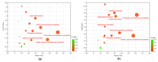 All the differential metabolites in different comparison groups were matched with the KEEG database to obtain the pathway information of metabolites and conduct enrichment analysis, and obtain the pathway enriched with more differential metabolites. The larger the bubble, the darker the color (Figure 3e–h). The main metabolites of CON and MOD were enriched in d-glutamine and d-glutamate metabolism, Taurine and hypotaurine metabolism, arginine biosynthesis and alanine, and aspartate and glutamate metabolism. Compared with the MOD group, the main differential metabolite enrichment pathways of KBF-L were alanine, aspartate, glutamate metabolism, and histidine metabolism. However, the KBF-M metabolic pathway had a uniform bubble size and five metabolite enrichment pathways. Meanwhile, compared with MOD, the metabolite concentration in the pathway of KBF-H tended toward CON. These metabolic pathways overlap suggesting that KBF could effectively improve the amino acid metabolism pathway, taurine, and hypotaurine metabolism, and then enhance the serum metabolism of high-fat diet rats to a normal state.