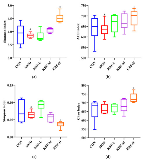 Alpha diversity indexes of (a) Chao; (b) ACE; (c) Shannon; (d) Simpson. Data are expressed as the mean ± SD (n = 6). (# p < 0.05, versus CON), (* p < 0.05, ** p < 0.01 versus MOD).