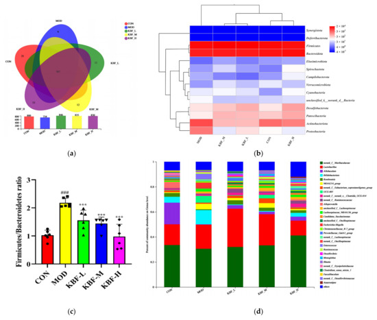 Effects of the kidney bean fermentation broth on the gut microbiota composition (a) Venn diagram. (b) Heatmaps of bacterial distribution at phylum taxonomic levels. (c) Ratio of Firmicutes and Bacteroidetes. (### p < 0.001 versus CON, *** p < 0.001 versus MOD), (d) Bacterial taxonomic profiling at genus taxonomic levels.