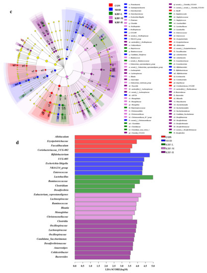 (a) βeta-diversity analysis based on unweighted Unifrac distance using PCoA. (b) The Lefse analysis at the genus level. (LDA score > 2, p < 0.05, FDR < 0.1), LDA results between MOD and KBF-H groups. (c) LDA results in all groups. (d) The significantly changed bacteria at the genus level based on LDA results in all groups.