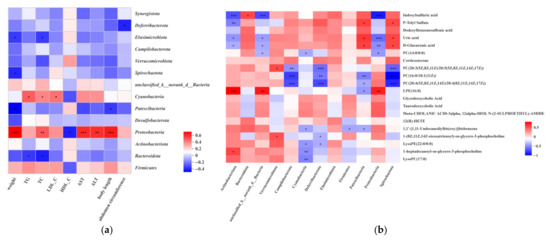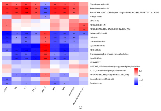 The correlation among targeted bacteria, apparent indicators, and metabolites (in serum and colon). (a) The correlation between apparent indicators and targeted bacteria (in colon and serum, directions of change in the top 30 genera). (b) The correlation between targeted bacteria and metabolites (directions of change in the top 50 metabolites). (c) The correlation between metabolites and apparent indicators (in colon and serum). Data were presented as mean ± SEM. Different letters indicated statistical differences between groups (* p < 0.05, ** p< 0.01 and *** p< 0.001).