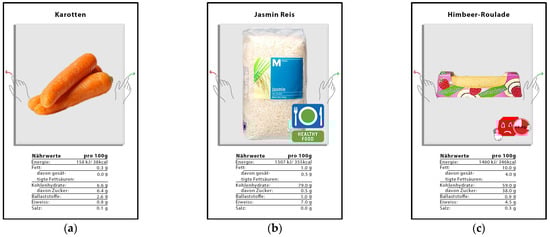 As stimulus material, we used pictures (taken with permission from the online store of one of the largest Swiss retailers) of 100 different foods (for simplicity, we use the term foods, but we also included some beverages) from nine different categories: beverages, bread, meat, dairy and eggs, veggie (vegetables and fruits), pasta (pasta, rice, and pasta sauce), snacks, sweets, and frozen food (see Appendix B Table A1 for detailed information). The selected foods should represent the diversity of a small grocery store. The pictures were supplemented with the names as well as the nutritional facts (the nutrition facts were shown to exclude the possibility that any FOP label effect is only due to a lack of information in the control group or condition) of the foods (see Figure 2a). Depending on which condition participants were randomly assigned to, the food picture contained either a label (i.e., Nutri-Score label, HFL, manga, or comic; see Figure 1b,c for some examples) or none (control condition). The Nutri-Score label is described in detail in the Introduction. The other summary indicator label is the newly developed Healthy Food Label (HFL,designed with the help of two designers—U. Binder and Th. Gfeller—from the ZHdK Zurich University of Applied Arts; Figure 1b). Like the Nutri-Score, the HFL is based on the FSA score, but categories A and B of the Nutri-Score are combined into one category with a green label, and categories D and E are combined into one category with a red label. The middle category C of the Nutri-Score is also the middle category in the HFL and is therefore given an orange label. Hence, the HFL has three categories. Note that the green label also contains the words “healthy food”. The other two labels, also newly developed (designed by members of the team), are two nutrient-specific labels (called manga and comic; see Figure 1c,d) that indicate the sugar content of a product using the TLL color system. The labels symbolize cubes with faces or a facial expressions. The face of the green labels looks cheerful, and its shape is rather thin. The faces of the orange labels are grumpy, and their shape is a bit puffier. The faces of the red labels are sad (manga) or angry (comic) and thick in shape. Faces or facial expressions were added to make them more visible (although basic research implies some benefits of faces in capturing attention [39,40,41], studies have not found that, for example, smileys are better than colored labels [34]), especially for children, on which they will be tested in the future.