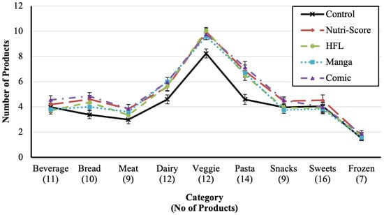 We see, for example (to illustrate the results in Table 2 or Figure 3), that the total number of food products purchased was significantly higher in the control condition (no label) than in the conditions with labels. However, a closer look at the post hoc tests shows that this effect is mainly due to the labels Nutri-Score and comic. These appear to lead to significant increases in the food products purchased in the bread, dairy, veggie, and pasta categories (all t > 3.06, p < 0.01) but not in the other categories (all t < 1.83, p > 0.06). Regarding the total number of healthy food products, on the other hand, all labels were advantageous. Furthermore, label effects were found in all categories (all t > 2.36, p < 0.05), except in the category sweets, as there were no healthy sweets. In terms of the other measures, we found mixed results. For example, in terms of total calories, only the comic label had an effect. Thereby, we found an effect in the same categories as the total number of products purchased. While the Nutri-Score only affected the number of (healthy) products, the other labels further affected either the total or the mean, the FSA score, calories, or sugar. For example, the comic label led to a reduction in total calories, while the HFL lead to a reduction in the mean FSA score. For detailed results, see Appendix A.