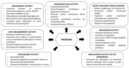 The pistachio is valued as an important source of bioactive components that, compared to other nuts, possesses a healthier nutritional profile with low-fat content composed mainly of MUFA, a high source of vegetable protein and dietary fibre, remarkable content of minerals, especially potassium, and an excellent source of vitamins, such as vitamins C and E. Its phytochemicals rich composition such as tocopherols, carotenoids and, importantly, phenolic compounds make pistachio an interesting food for its potential to prevent prevalent pathologies. The first health claim approved by the United States FDA in 2003 informed that there is scientific evidence that suggests, although does not demonstrate, that eating 1.5 oz (42.5 g) each day of nuts within a low saturated fat and cholesterol diet, may diminish the heart disease risk, was a turning point for nuts. A growing interest in confirming nuts effect on health has led to an increase in the quantity of research on nuts. Although pistachio has been less explored than other nuts (walnut, almonds, hazelnut, etc.), some studies provide evidence of its beneficial effects on CVD risk factors beyond the lipid-lowering effect. Different studies showed that diets supplemented with pistachios present a preventive effect to T2DM due to its effect of improving markers of glucose homeostasis, decreasing oxidative stress, alleviating post-prandial hyperglycemia and reducing the rate of gestational diabetes, among others. Regarding the most concern issue regarding pistachio intake, recent results showed neither weight gain nor obesity risk, but rather the opposite. A tendency to decrease and/or maintain weight as well as improve and/or maintain anthropometric parameters was observed and, in part, due to its positive effect on controlling appetite and enhancing satiety feeling, although more studies are needed to evaluate this aspect thoroughly. Likewise, the pistachio could play an important role in cancer prevention due to its ability to induce cytotoxicity and apoptosis in neoplastic cells, as well as the modulatory activity of signaling pathways involved in the regulation of cancer observed in carcinogenic cell models. The phytochemicals would be behind the demonstrated anti-inflammatory and antioxidant activities associated with pistachios, which would explain the ability to prevent the chronic diseases mentioned (CVD, T2DM, obesity, and cancer). Finally, there are more and more studies that inform about the pistachio’s ability to modulate the activity of gut microbiota, increasing the abundance of beneficial bacteria, although more studies are needed to gain robust conclusions.