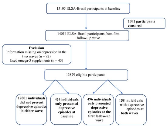 The current study included eligible participants of both sexes from the baseline and first follow-up wave, totaling 13,879 individuals. We excluded individuals that did not participate in the first follow-up wave of ELSA-Brasil (n = 1091), those who reported consumption of omega-3 supplements (n = 43), and subjects with incomplete or missing data related to mental and dietary health questions (n = 92) (Figure 1).