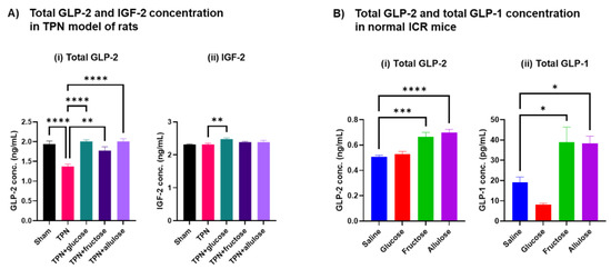- Murali, S.G.; Brinkman, A.S.; Solverson, P.; Pun, W.; Pintar, J.E.; Ney, D.M. Exogenous GLP-2 and IGF-I induce a differential intestinal response in IGF binding protein-3 and -5 double knockout mice. Am. J. Physiol. Gastrointest. Liver Physiol. 2012, 302, G794–G804. [Google Scholar] [CrossRef] [PubMed]
