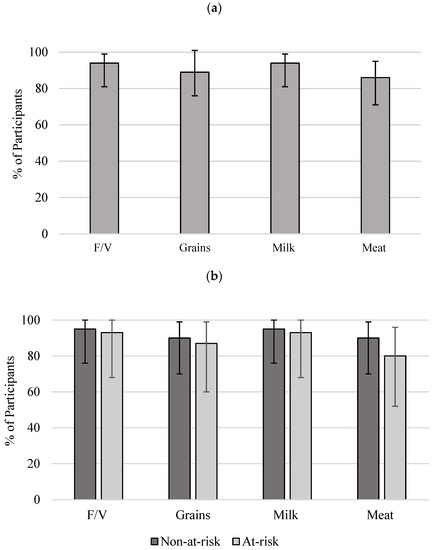 A great number of participants were not meeting the recommendations. Vegetables and Fruit and Milk and Alternatives food groups were not met by 94% of participants; followed by Grain Products, where 89% of participants had not met the recommendations. The food group in which the least number of participants (86%) had not met the recommendations was Meat and Alternatives (Figure 1). There were no significant differences between at-risk and non-at-risk proportions for any of the four food groups.