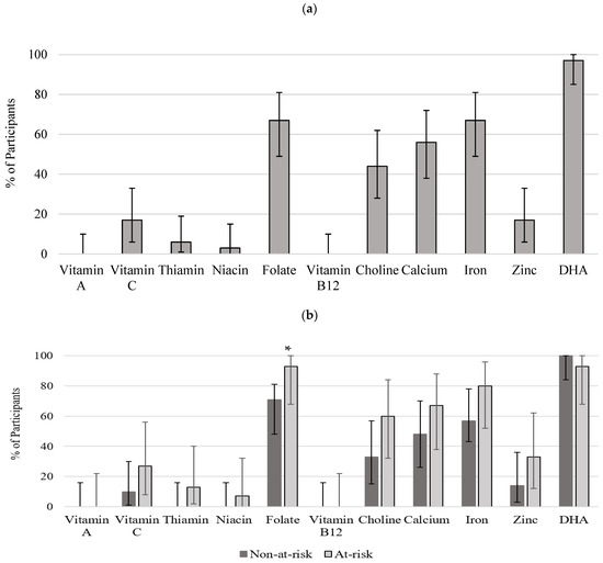 Proportion of participants not meeting DRI recommendations (a) all women (n = 37); (b) non-at-risk (n = 22) and at-risk (n = 15). Bars represent proportions and 95% CI. * significant difference (p < 0.05) between non-at-risk and at-risk groups. DRI: estimated average requirement (EAR) for pregnant women aged 14–18, 19–30, and 31–50 for vitamins A, C, B1, B12, folate, niacin, zinc, calcium, iron; adequate intake (AI) for choline [1]. Recommendations for DHA (C22:6n−3) were obtained from International Society for the Study of Fatty Acids and Lipids [24].