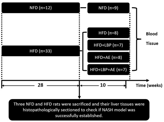 Eight-week-old male Sprague–Dawley rats (180–220 g) were obtained from the Experimental Animal Center of Ningxia Medical University (license number: SCXK Ning. 2015-0001) and maintained on a 12-h light/12-h dark cycle. All rats had free access to food and drink. Rats were randomly distributed into two groups: the normal-fat diet group (NFD) consuming the normal diet (Beijing Keao Xieli Feeds Co., Ltd., Beijing, China, n = 12), and the high-fat fed diet group (HFD) (60 kcal% from fat, MD12033, Medicience Ltd., Jiangsu, China, n = 33). Twenty-eight weeks later, three NFD and HFD rats were sacrificed, and their liver tissues were histopathologically sectioned to check if NASH models were successfully established according to Guidelines for the diagnosis and treatment of nonalcoholic fatty liver diseases [26]. Nonalcoholic fatty liver activity score (NAS) was used for evaluating liver damage. Then rats in HFD group were randomly assigned into four groups: HFD (high-fat diet) (n = 8), HFD plus LBP (high-fat diet with LBP supplement, 100 mg/kg) (n = 7), HFD plus AE (high-fat diet and aerobic exercise) (n = 8), HFD plus LBP plus AE (high-fat diet with supplementation of LBP combined with aerobic exercise) (n = 7) for 10 weeks (Figure 1).
