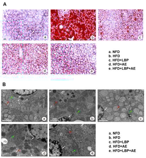 As a heteropolysaccharide, Lycium barbarum polysaccharide (LBP), one of the main active components of Lycium barbarum, exhibits a range of effects of promoting health, such as lowering blood glucose [10], lowering blood lipids [10], regulating immunological activities [11], reducing oxidative stress [12] and so on. There have been some studies demonstrating that LBP is beneficial to the liver. LBP markedly decreases the accumulation of triglyceride in the liver by deacetylation of SIRT1 [13]. Using a methionine-choline deficient mouse as a NASH model, LBP was found to have hepatoprotective effects by suppressing NLRP3/6 pathway and NF-κB activation [14]. Moreover, oxidative stress, lipid accumulation, and inflammatory response in the liver were reported to be improved by LBP based on the NASH rats and cellular steatosis model [15].
