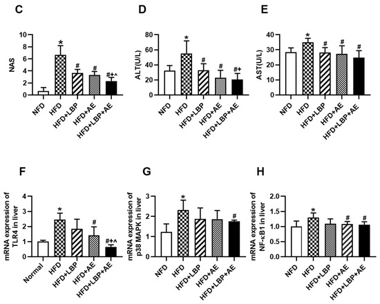 LBP plus AE ameliorated the hepatic injury. (A) Oil red O staining of the liver tissue was photographed at 200× magnification. (B) Transmission electron microscopy of the liver histology was photographed at 6000× magnification. White arrow: nucleus. Red arrow: mitochondrion. Green arrow: rough endoplasmic reticulum. (C) Hepatic NAS in different groups. (D) Serum levels of ALT. (E) Serum levels of AST. (F) mRNA expression of TLR4 in liver. (G) mRNA expression of p38 MAPK in liver. (H) mRNA expression of NF-kB1 in liver. * p < 0.05 vs. the NFD group. # p < 0.05 vs. the HFD group. + p < 0.05 vs. the HFD plus LBP group. ^ p < 0.05 vs. the HFD plus AE group.