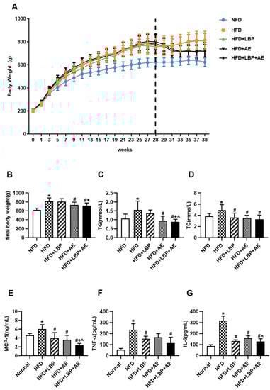LBP plus AE reduced body weight, serum lipid as well as inflammation levels. (A) Body weight throughout the 38-week period. (B) Final body weight. (C) Serum levels of TG. (D) Serum levels of TC. (E) Serum levels of MCP-1. (F) Serum levels of TNF-α. (G) Serum levels of IL-6. * p < 0.05 vs. the NFD group. # p < 0.05 vs. the HFD group. + p < 0.05 vs. the HFD plus LBP group. ^ p < 0.05 vs. the HFD plus AE group.