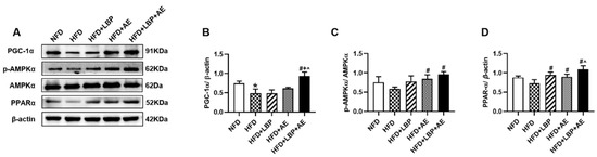 LBP plus AE activated AMPK/PPARα/PGC-1α pathway to ameliorate NASH. (A–D) Western blot images and quantitative band density analyses in different groups. * p < 0.05 vs. the NFD group. # p < 0.05 vs. the HFD group. + p < 0.05 vs. the HFD plus LBP group. ^ p < 0.05 vs. the HFD plus AE group. Three samples of mice in each group were used and western blot was repeated three times.