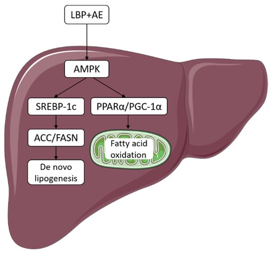 In summary, our study identified effective effects of supplementation of LBP combined with AE on NASH induced by a high-fat diet in a Sprague–Dawley rat model. LBP plus AE not only promoted DNL by activating AMPK to affect the expression of related enzymes, but also enhanced FAO by AMPK/PPARα/PGC-1α pathway.