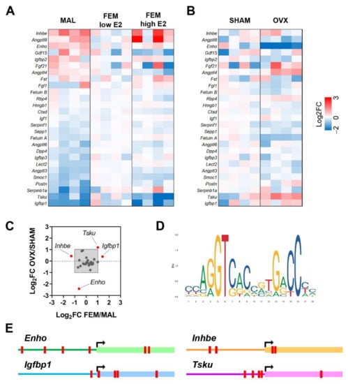Sex and estrogen levels affect hepatokine mRNA levels in the liver of mice under physiological conditions. (A,B) Heatmaps reporting as Log2 fold change (FC) the mRNA levels of the most relevant hepatokines known to be involved in NAFLD from RNA-Seq analysis performed in the livers of males (MAL) and females (FEM) at low and high levels of estrogens (A) and in the livers of sham-operated (SHAM) and ovariectomized (OVX) female mice (B) (n = 4). (C) Cluster analysis performed by plotting the Log2 FC of fertile females (FEM) over males (MAL) against the Log2 FC of OVX over SHAM females. Enho, adropin; Inhbe, inhibin subunit beta E; Igfbp1, insulin like growth factor binding protein 1; Tsku, tsukushi. (D,E) Estrogen-responsive elements (EREs) identified in the region −/+1000 around TSS of Enho, Inhbe, Igfbp1, and Tsku (EREs are shown as red blocks).