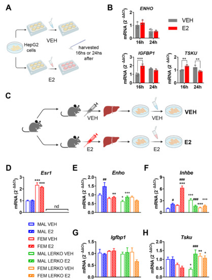 Estrogen modulates hepatokine mRNA levels in hepatic cells acting through ERα. (A) Experimental design employed to evaluate the effects of estrogen treatment in HepG2 cells. (B) mRNA content of ENHO, IGFBP1, and TSKU measured by RT-PCR in HepG2 cells treated with vehicle (VEH) or 1 nM 17β-estradiol (E2) for 16 or 24 h. Data are presented as mean ± SEM (n = 3). ** p < 0.01 and *** p < 0.001 vs. VEH-treated cells. (C) Experimental design employed to evaluate the effects of estrogen treatment in primary hepatocyte cells derived from male and female control or LERKO mice treated with VEH or E2. (D–H) mRNA content of Esr1 (D), Enho (E), Inhbe (F), Igfbp1 (G), and Tsku (H) measured by RT-PCR in hepatocyte cells derived from male and female control or LERKO mice treated with VEH or E2. nd = not determined. Data are presented as mean ± SEM (n = 3–4). ** p < 0.01 and *** p < 0.001 vs. male-derived hepatocytes; # p < 0.05, ## p < 0.01 and ### p < 0.001 vs. VEH-treated cells; + p < 0.05 and +++ p < 0.001 vs. control-derived hepatocytes by two-way ANOVA followed by Bonferroni’s post hoc test.