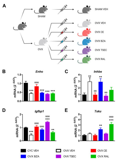 RAL was unable to bring Enho, Inhbe, and Igfbp1 mRNA values back to those of fertile females, even if there is a trend, still not significant, to reduce Inhbe mRNA levels compared to OVX females (Figure 3B–D). RAL raised Tsku mRNA levels three times higher than those measured in VEH-treated fertile and OVX females (Figure 3E).
