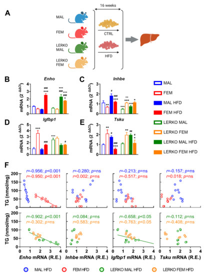 Enho mRNA levels negatively correlate with fatty liver in a HFD-induced mouse model of NAFLD. (A) Experimental design adopted to evaluate the relevance of estrogen signaling in the liver metabolic response to a high-fat diet (HFD). (B–E) mRNA contents of Enho (B), Inhbe (C), Igfbp1 (D), and Tsku (E) measured by RT-PCR in the liver of male and female control and LERKO mice fed with control diet or HFD. Data are presented as mean ± SEM (n = 8–10). * p < 0.05, ** p < 0.01, and *** p < 0.001 females vs. males; # p < 0.05, ## p < 0.01, and ### p < 0.001 HFD vs. control diet; ++ p < 0.01 and +++ p < 0.001 LERKO vs. control mice by two-way ANOVA followed by Bonferroni’s post hoc test. (F) Pearson’s correlation and linear regression between liver triglyceride (TG) content and relative expression (R.E.) of Enho, Inhbe, Igfbp1, and Tsku mRNA levels measured in the liver of male and female control and LERKO mice fed with HFD.