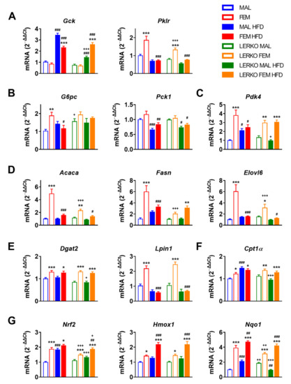 Sex-specific metabolic adaptation to HFD depends on hepatic ERα. (A–G) mRNA contents of key genes involved in glycolysis (A), gluconeogenesis (B), regulation of glucose metabolism (C), fatty acid synthesis and elongation (D), triglyceride synthesis (E), fatty acid catabolism (F), and oxidative stress response (G) measured by RT-PCR in the liver of male and female control and LERKO mice fed with control or HFD. Data are presented as mean ± SEM (n = 8–10). * p < 0.05, ** p < 0.01 and *** p < 0.001 females vs. males; # p < 0.05, ## p < 0.01 and ### p < 0.001 HFD vs. control diet; +p < 0.05, ++ p < 0.01 and +++ p < 0.001 LERKO vs. control mice by two-way ANOVA followed by Bonferroni’s post hoc test. Gck, glucokinase; Pklr, pyruvate kinase; G6pc, glucose-6-phosphatase; Pck1, phosphoenolpyruvate carboxykinase 1; Pdk4, pyruvate dehydrogenase kinase 4; Acaca, acetyl-CoA carboxylase alpha; Fasn, fatty acid synthase; Elovl6, ELOVL fatty acid elongase 6; Dgat2, diacylglycerol O-acyltransferase 2; Lpin1, Lipin 1; Cpt1a, carnitine palmitoyltransferase 1A; Nrf2, nuclear factor erythroid 2–related factor 2; Hmox1, heme oxygenase 1; Nqo1, NAD(p)H quinone dehydrogenase 1.