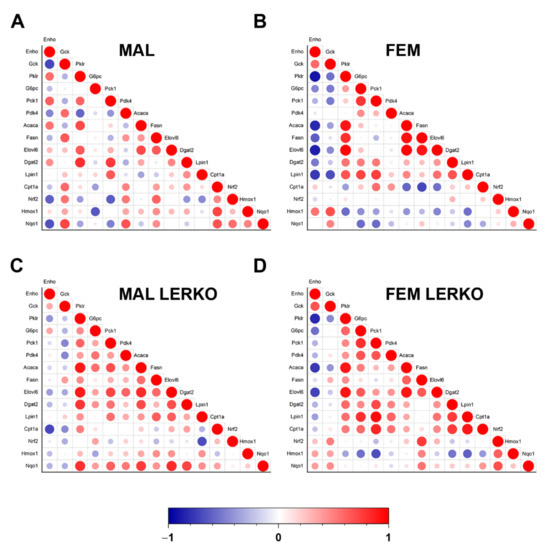Adropin mRNA content negatively correlates with lipid synthesis in the liver of female mice. (A–D) Correlation scatter plots showing the positive (in red) and negative (in blue) correlation between mRNA levels of Enho and key genes involved in glycolysis, gluconeogenesis, regulation of glucose metabolism, fatty acid synthesis and elongation, triglyceride synthesis, fatty acid catabolism, and oxidative stress response measured by RT-PCR in the liver of control males (A), control females (B), LERKO males (C), and LERKO females (D). The color-coded scale indicates the correlation coefficient values.